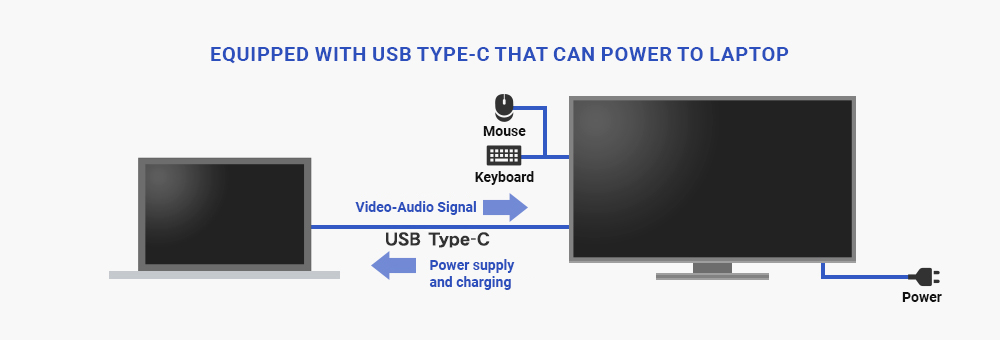 Using USB Type-C cable allows you to handle video, audio and power delivery to your laptop and charging with a single cable, minimizing the number of outlets required.
