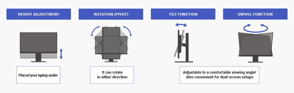 This LCD monitor has a freestyle stand that can be adjusted to your comfortable height and angle. If your computer has a USB Type-C port, you can simultaneously output video signals to the LCD monitor and deliver power to your laptop with just one cable. It also features 2-port USB hub that allows you to keep devices such as a mouse, keyboard, or webcam permanently connected to the product.